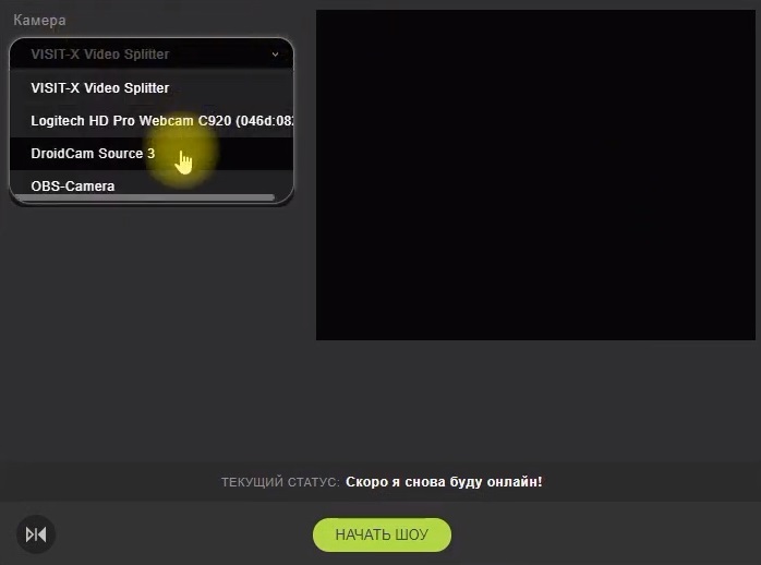 При трансляции на сайтах, в качестве камеры выбираем “DroidCam Sourse” (рис. 6)