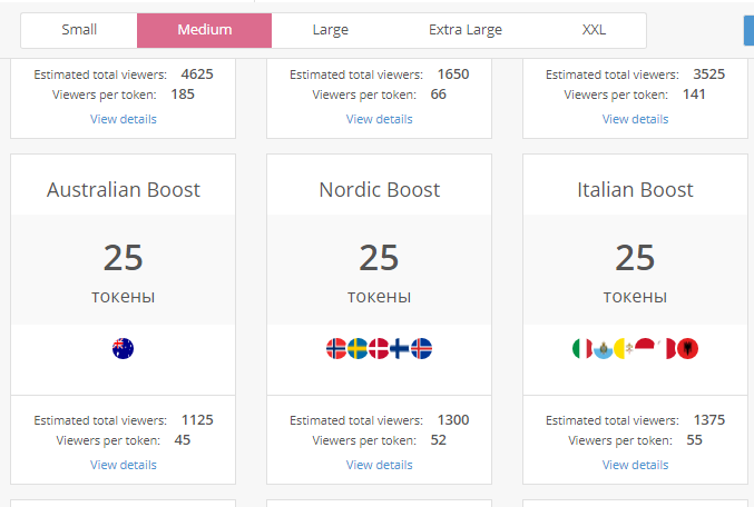 Всего в настройках 3 пункта для выбора. первый оставляем без изменений, второй - выбор вашего профиля на сайте, на который мы будем направлять трафик, третий - выбор пакета для трафика. Здесь стоит внимательно подойти к выбору, в зависимости от времени в котором вы транслируете, пользователей, которые, чаще всего находятся на вашей трансляции, а так же, тематике шоу. К примеру: Если основной костяк вашей трансляции - пользователи с Англии(и англоязычных стран), а время в котором вы транслируете, например, вечер по европейскому времени - то пакет English Boost будет идеальным выбором. Так же при выборе пакета стоит обратить внимание и на его размер ("small" Medium" "large"....)(рис. 9). Для пробного запуска, советую выбрать Medium, а в случае ели эффект от выбранного пакета будет положительно ожидаемым - выбирайте в дальнейшем пакеты Large и Extra Large - их будет хватать на более долгий эффект.