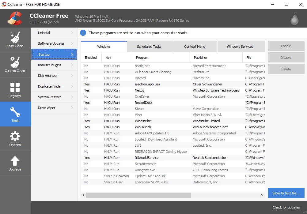 Теперь компьютер будет чувствовать себя лучше, однако, это не весь функционал программы. На работу компьютера, также могут влиять автоматически запущенные программы во время загрузки. К примеру, тот же самый Skype или Viber на фоне работы, у не слабого компьютера может сильно перегружать систему. Чтобы избавится от автоматического запуска программы при загрузке, открываем вкладку “Tools” В подменю выбираем “Startup”. Нам откроется список служб и программ, серые - с выключенным автозапуском, черные - с включенным. Чтобы выключить автозапуск программы, выбираем её из списка и в меню справа нажимаем “Disable”. (рис. 3)