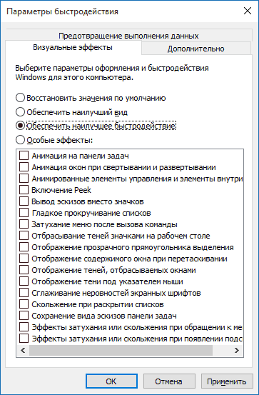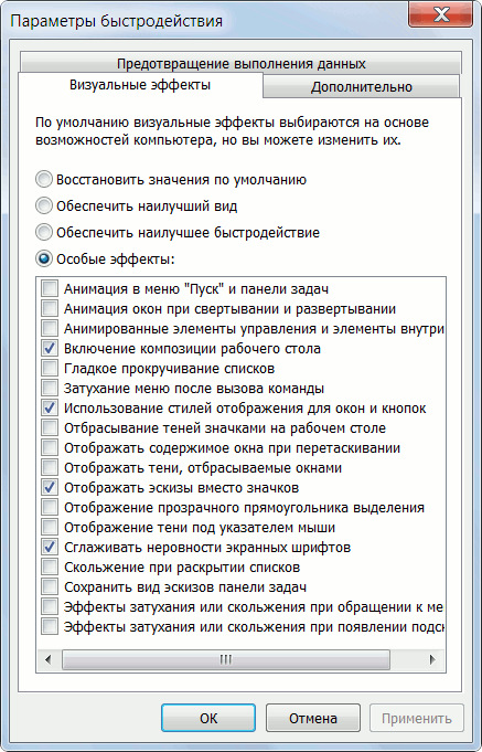 Windows 7 - заходим в «Панель управления -> Система -> Дополнительно -> Параметры» и отключаем часть галочек либо выбираем «Обеспечить наилучшее быстродействие». (рис. 6)