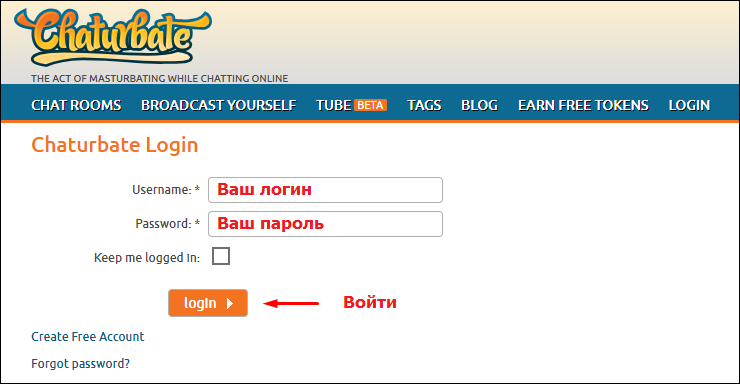 Далее у вас откроется окно сайта Chaturbate, введите туда данные и нажмите кнопку "Login" (войти) как показано на рисунке: