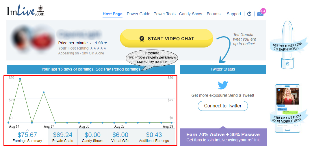 Сайт Imlive отличается тем, что заработок не отображается на страничке модельного чата в реальном времени. Для уточнения количества полученных чаевых,нужно обновить профильную страницу ImLive (ту страницу, куда вы заходите, введя логин и пароль от сайта ImLive). Новые модели не всегда об этом знают, по этому этом вебкам сайте ОЧЕНЬ распространен обман новых моделей.